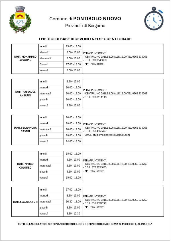 Si allegano i nuovi orari dei medici Akkouch e Liti di Pontirolo Nuovo, aggiornati al 23.04.2026 e in vigore dal 27.04.2026.