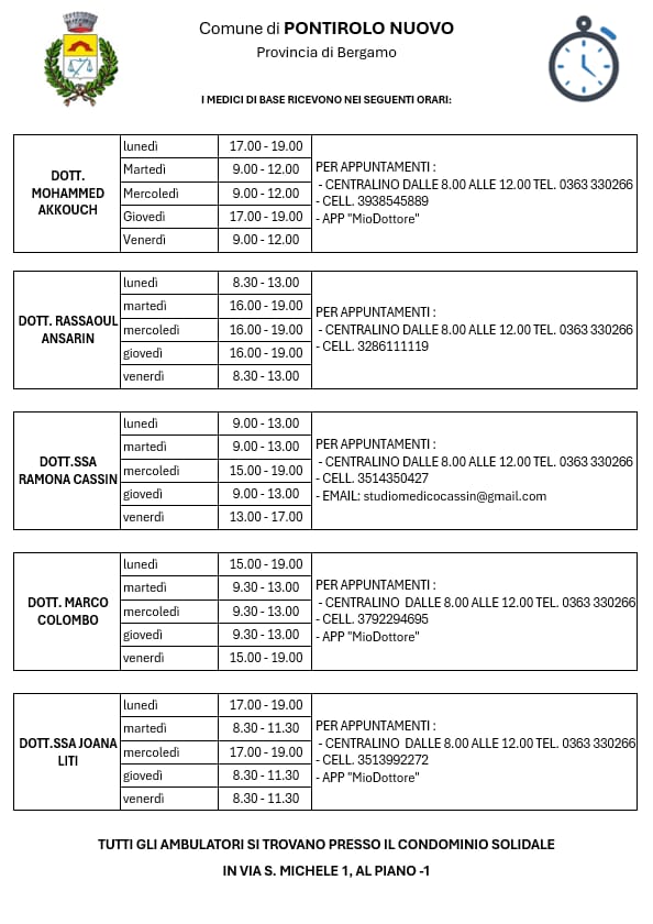 Si allegano i nuovi orari dei medici di Pontirolo Nuovo.
